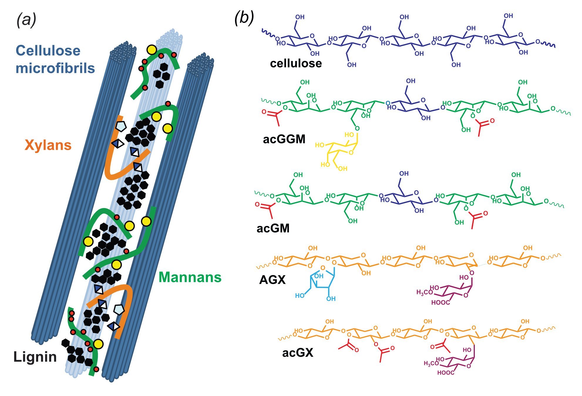 Figure 1. Structure of lignocellulose biomass. (a) Schematic illustration of the molecular components of lignocellulosic biomass, including cellulos microfibrls, xylans, mannans and lignin (modified from Green Chemistry, 2020, 22, 3956-3970 with permission under the Creative Commons License CC-BY-NC); (b) Average molecular structure of polysaccharide components in lignocellulose: cellulose, acetylated galactoglucomannan (acGGM) from spruce, acetylated glucomannan (acGM) from birch, arabinoglucuronoxylan (AGX) from spruce, acetylated glucuronoxylan (acGX) from birch (reproduced from Nature Communications 11, 4692 (2020), with permission under the Creative Commons License CC BY 4.0)