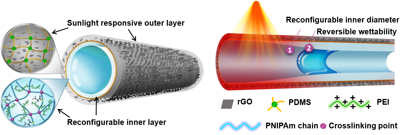 Based on similar mechanism, we took advantage of the reversible coil-globule phase transformation of the poly(N-siopropylacrylamide), realized a sunlight-powered water pump (Angew. Chem. Int. Ed. 2018, 130, 15661, https://onlinelibrary.wiley.com/doi/full/10.1002/ange.201808835) and Intelligent solar water evaporation (Angew. Chem. Int. Ed. 2018, 57, 16343, https://onlinelibrary.wiley.com/doi/full/10.1002/anie.201810345). Inspired by the natural botanical phenomena, e.g. the stomatal opening/closing of plant leaves, we used thermally responsive and microstructured graphene/poly(N‐isopropylacrylamide) (mG/PNIPAm) membrane to regulate the water transpiration rate. The as-prepared smart solar water evaporation system shows fast water evaporation through reversible pore opening under weak light and high water evaporation rate under intense light irradiation by controlling the open and closure of the microstructures. Similarly, we modified the inner wall of a poly(dimethylsiloxane) (PDMS)/reduced graphene oxide (rGO) tube with the poly(N-siopropylacrylamide) hydrogel (Figure 1), a device consists of two layers for stimuli responsive water transportation was obtained: a photothermal outer layer (PDMS/rGO) and a reconfigurable inner layer (thermal responsive hydrogel). The inner hydrogel layer exhibits reversible hydrophilic/hydrophobic transformation and reconfiguration as the outside is self-heated on exposure to sunlight irradiation. This tubular shape integrates capillary force and wettability gradients, allowing complicated water manipulation and long-distance water transportation.