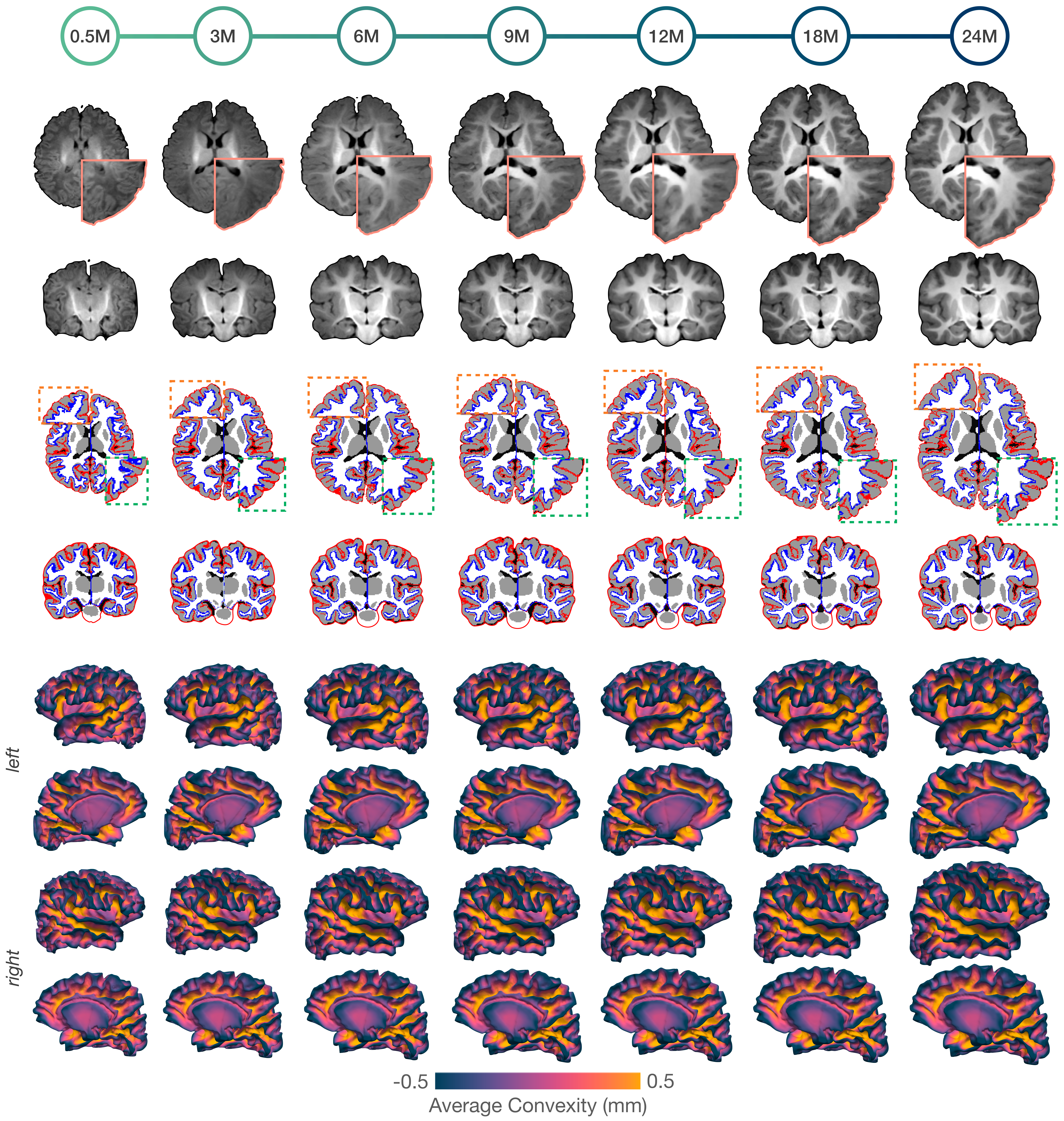 Our infant brain atlas (IBA) at each month faithfully captures the sulcal and gyral features of primary, secondary, and tertiary cortical folds (Figure 1), with developmental timing and left-right lateralization coherent with prior knowledge on early brain development. Our atlases preserve spatiotemporally heterogeneous trajectories of detailed folding and tissue features of the developing brain. Primary visual and motor cortices more developed during infancy experience less changes, in contrast to higher-order cortices that undergo delayed functional development associated with for example decision making, critical thinking, and reasoning.