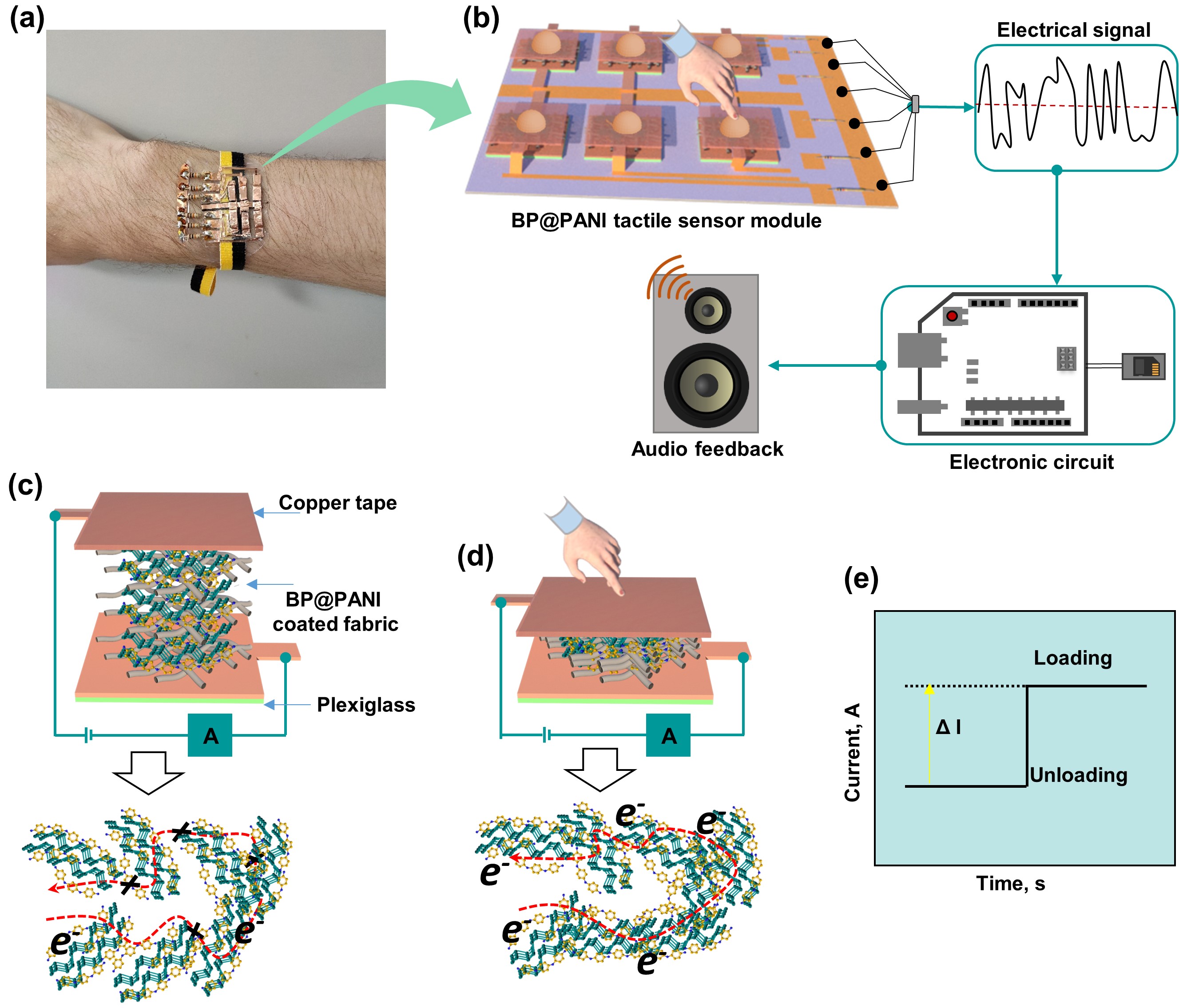 Herein, we demonstrated a proof-of-concept auditory feedback system based on black phosphorous/polyaniline (BP@PANI) tactile sensor. This system function bidirectional, providing touch sensing and feedback functions. Touch-to-audio conversion focuses on human-machine communication interfaces for the visually disabled; the prototype auditory feedback system employs a six-pixel BP@PANI tactile sensor corresponding to the six dots in braille writing slate to convert touch in various braille patterns to an audio signal that speaks the relevant word (see Figure 1). Finally, we exhibited real touch to the audio conversation by pressing different braille letters from A to G and pronouncing the single word “nanomaterials” and a typical conversation between human and machine (see Movie 1).