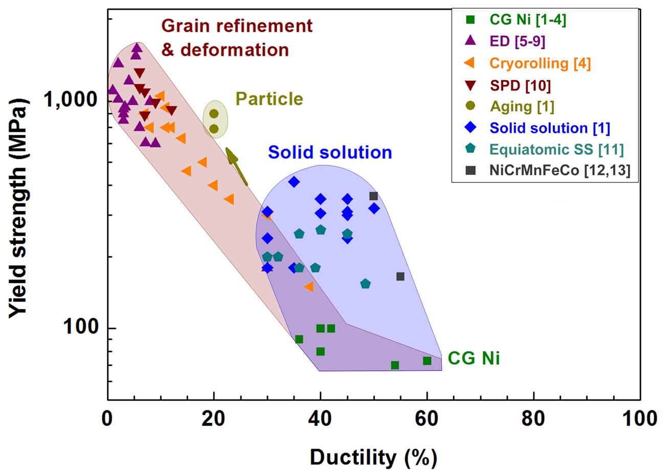 Figure 1. Comparison of yield strength and ductility of four strengthening mechanisms (grain refinement, deformation, particle and solid solution) in Ni1-13. CG - coarse-grained, ED - electro-deposition, SPD - severe plastic deformation, SS - solid solution.