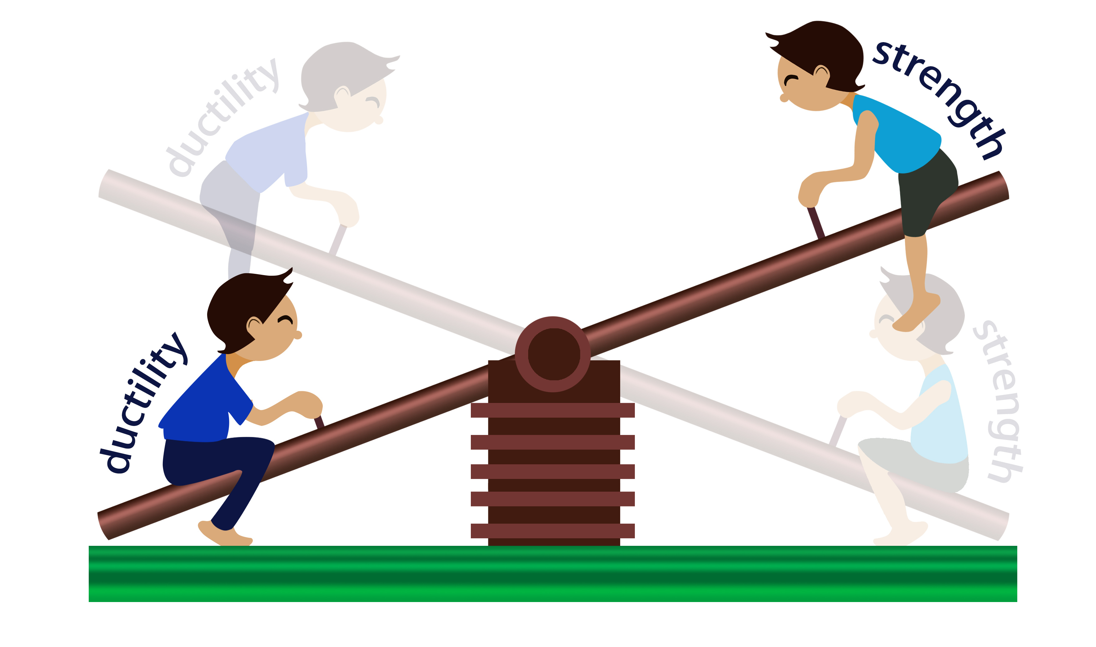 Figure 2. Schematic representation of the trade-off relationship between strength and ductility. Strength and ductility consume each other. The increase of strength is accompanied by the decrease of ductility. On the contrary, only the decrease of strength can reward the increase of ductility.