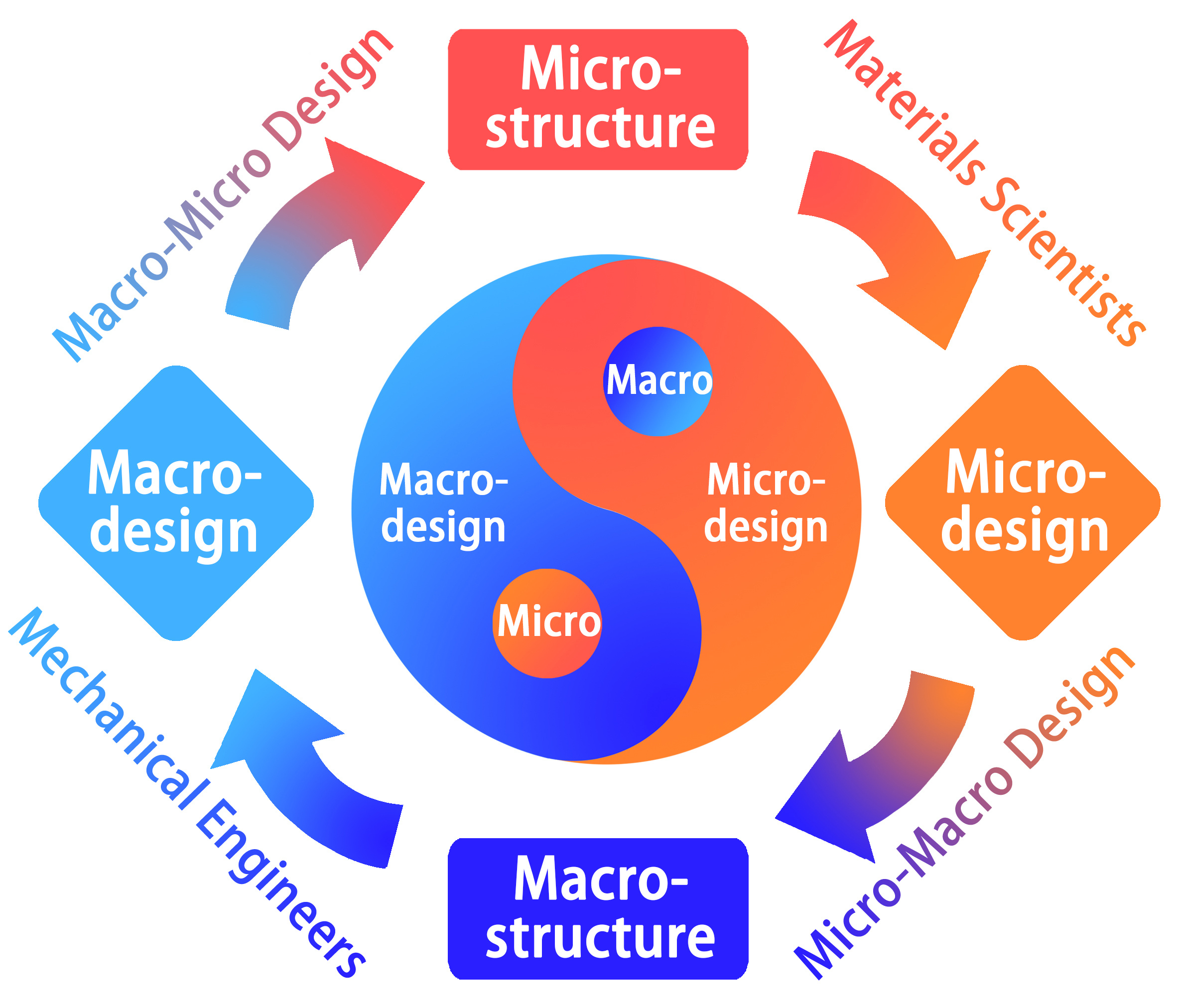 Figure 4. Schematic representation of our macro directional design of microstructure (MDDM, or micro-macro design). Usually, mechanical design engineers only macro-design the macro-structure without considering the microstructure of materials; while material scientists only micro-design the micro-structure without considering the macro-structure. Our MDDM design concept sets up a bridge from micro to macro. The circular pattern in the center adopts the creation idea of Taiji diagram in the ancient Chinese Philosophy book of Changes. The original meaning is that all things have evolved from the intersection of Yin and Yang. There is Yang in Yin and Yin in Yang, and the Yin and Yang always transform each other. Here we use similar idea to express the relationship between macrodesign and microdesign.
