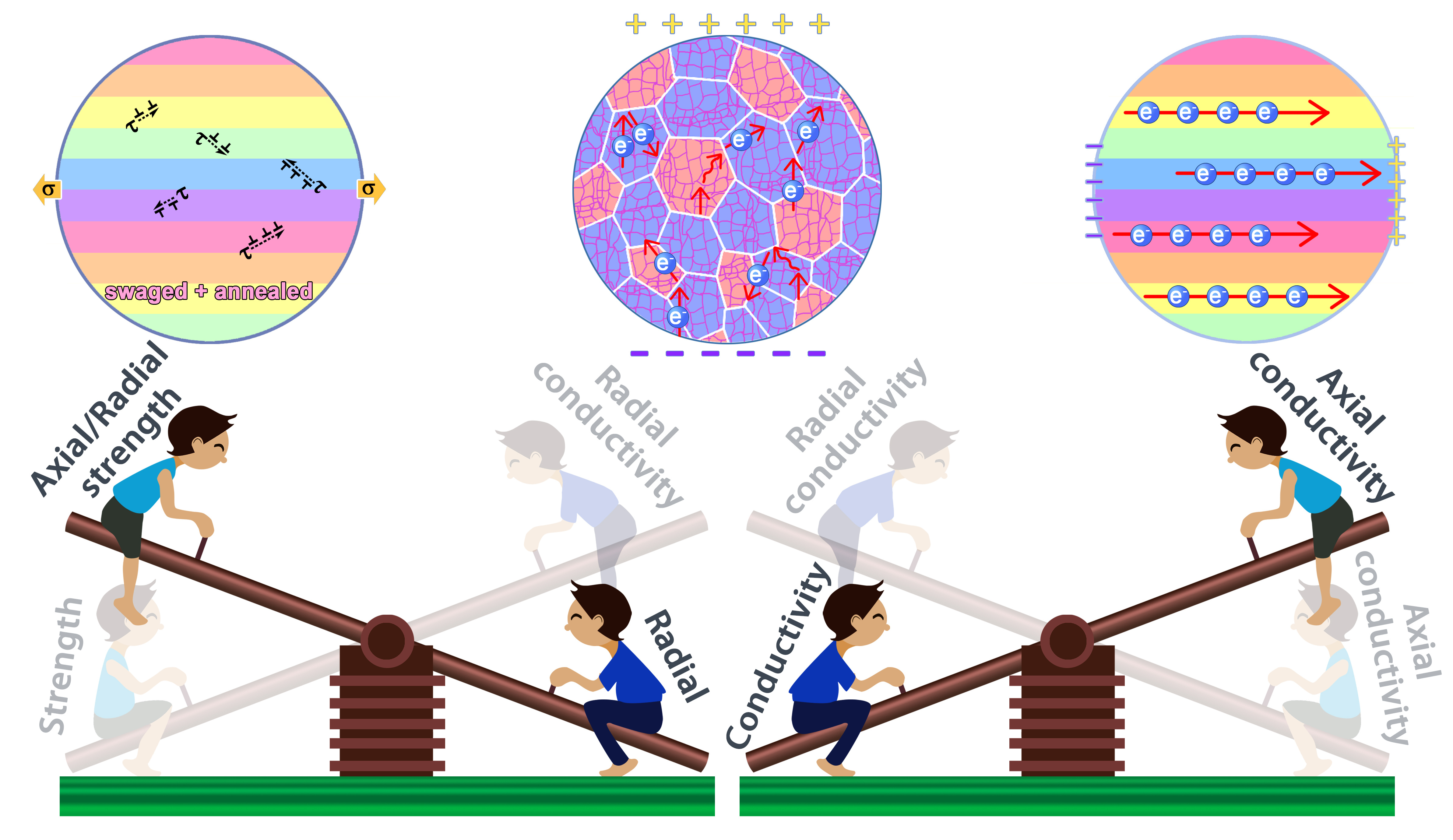 Figure 3. Schematic representation of the MDDM infulence on the strength and conductivity trade-off relationship. Our macro directional design ingeniously places the strength and conductivity at the two high ends of the seesaws in the axial direction of the copper wire, while the conductivity in the radial direction is placed at the low ends of the seesaws.