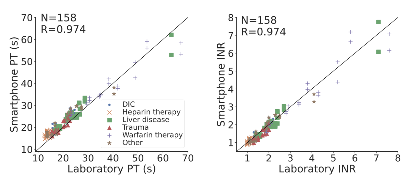 We tested our system across 159 whole blood samples, 79 of which had a clotting disorder, and 140 plasma samples. The results of our test were strongly correlated with traditional measurement devices used in the lab or at-home.