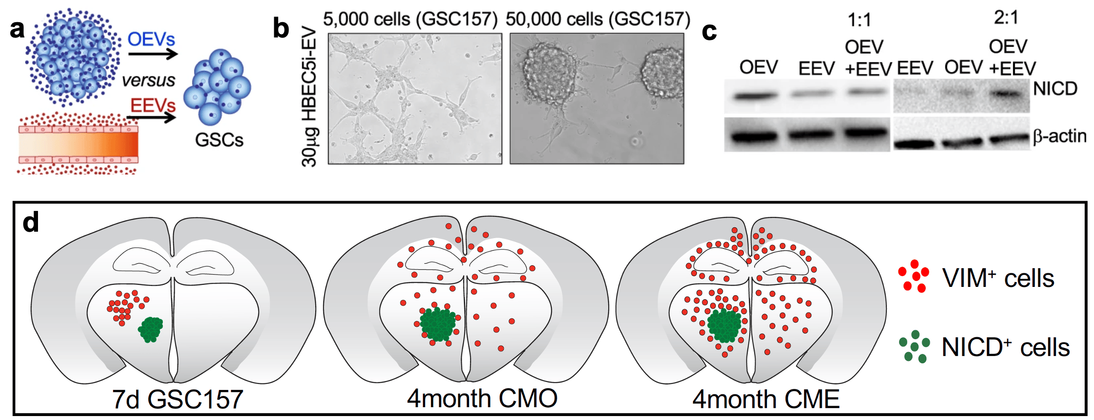 Finally, we identified that a competition exists for EV uptake by proneural GSCs where the cells preferentially took up EEVs relative to their own EVs (OEVs). The proneural to mesenchymal switch was rescued when excessive OEVs were supplied in the presence of EEVs (Fig.2a-c). In mouse experiments, we observed that just 7 days after intracranial injection of proneural GSCs, a bulk cell population at the injection site expressed NICD+VIM- and a cohort of migratory GSCs expressed NICD-VIM+. The bulk cells were enriched in OEVs while the scattered GSCs responded to EEVs. Pre-treatment of proneural GSCs with unfractionated endothelial secretome enabled migration of a greater number of VIM+proneural GSCs in the distinct regions of the brain (Fig.2d). Likewise, a higher number of VIM+ cells were found in vivowhen proneural GSCs were pretreated with EEVs relative to OEVs.