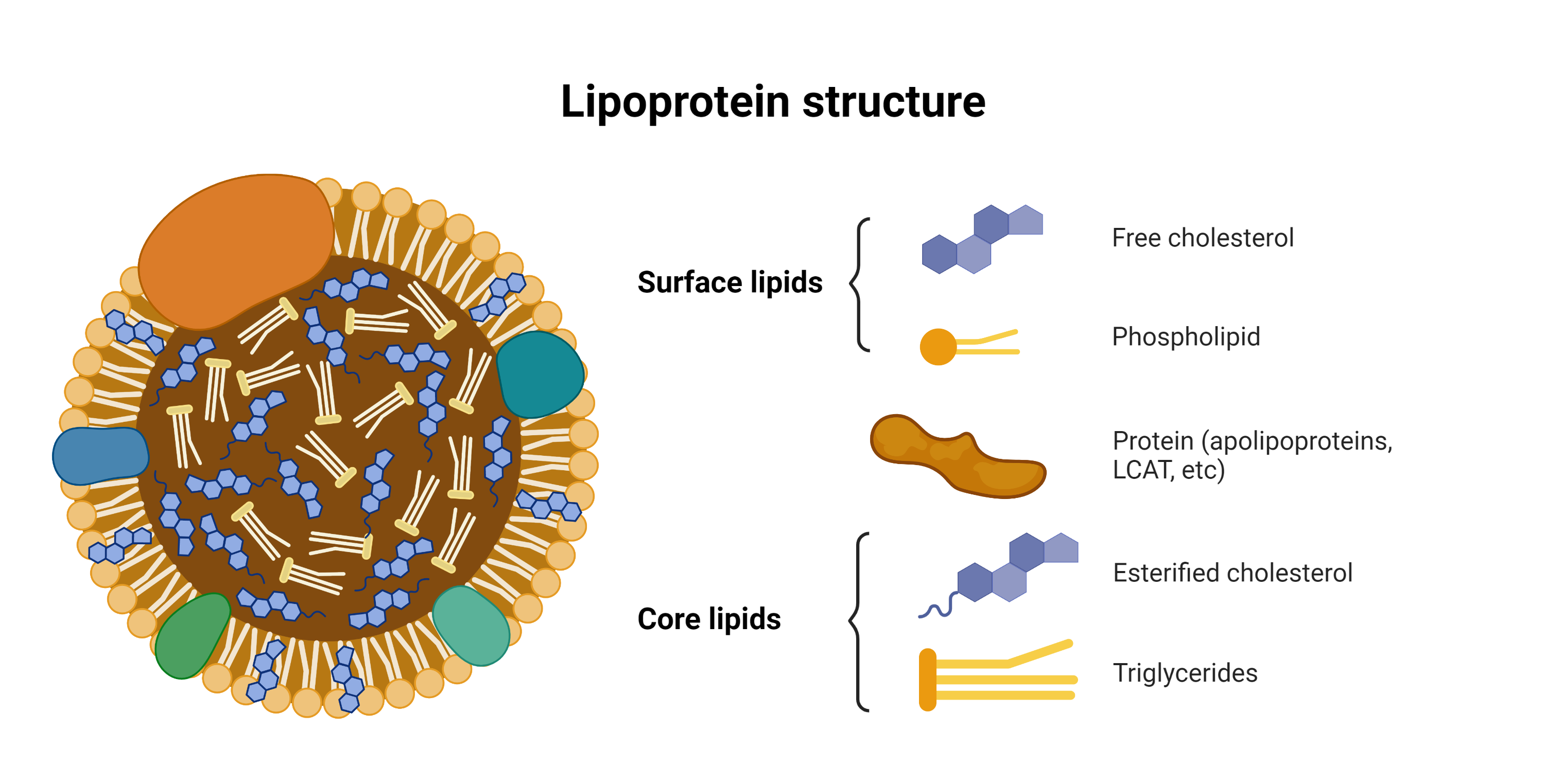 Lipids are essential biomolecules used for energy storage and consumption (among many other functions). Because lipids are non-soluble, they are transported in the blood in the form of lipoproteins. These are spherical macromolecules formed by an outer layer of phospholipids (making lipoproteins soluble), apolipoproteins, and other proteins and a lipidic core of cholesterol and triglycerides.