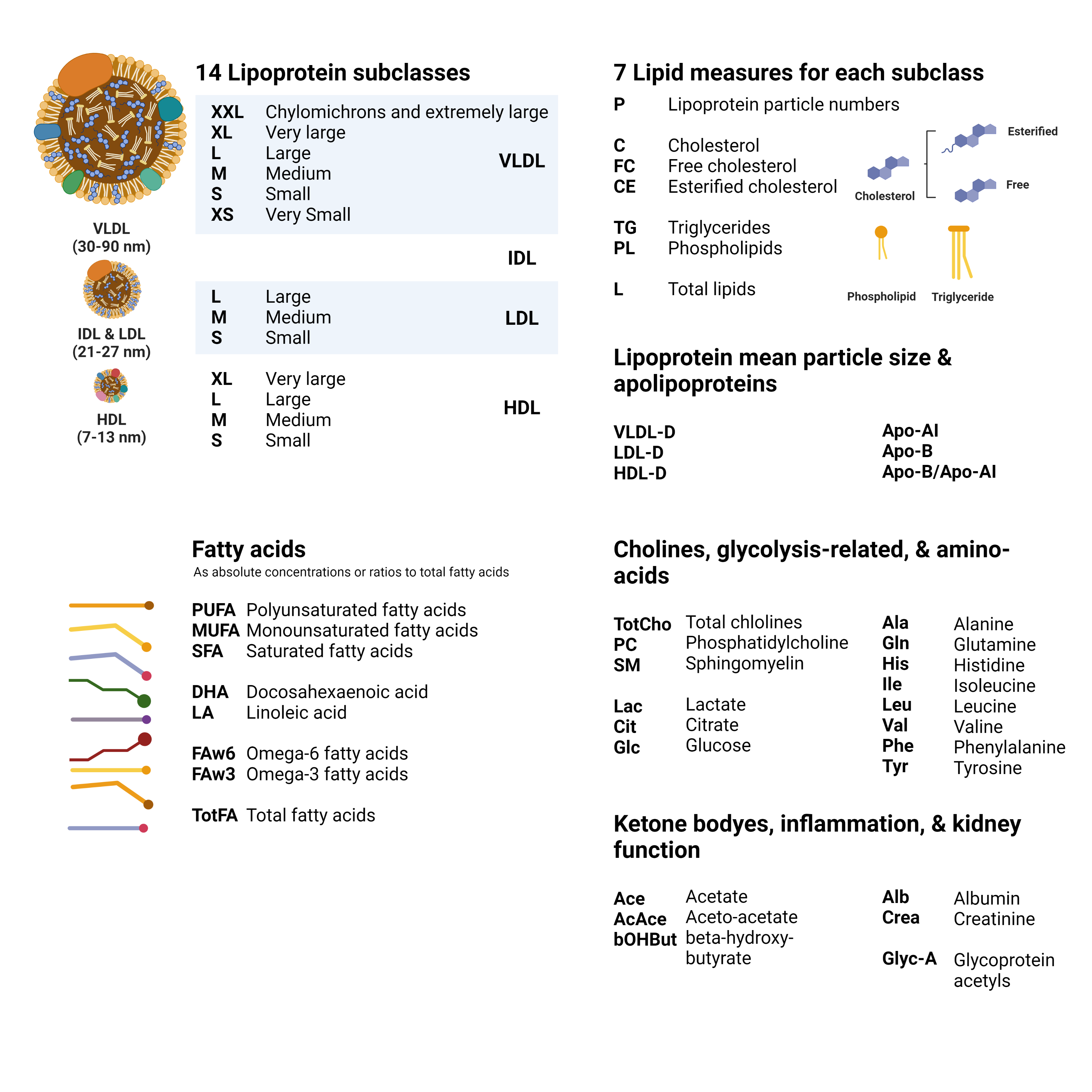 Blood-based nuclear magnetic resonance (NMR) spectroscopy metabolomics provides a fine-grain quantitative profile of lipoprotein lipids, including the concentrations of these particles across 14 different size-based subclasses: 6 VLDLs, IDL, 3 LDLs, and 4 HDLs, as well as the lipid content of each lipoprotein subclass (including cholesterol, triglycerides, and phospholipids). This platform also provides information on apolipoproteins, fatty acids, cholines, glycolysis-related metabolites, amino acids, ketone bodies, creatinine, albumin, and glycoprotein acetyls (a marker of chronic inflammation).