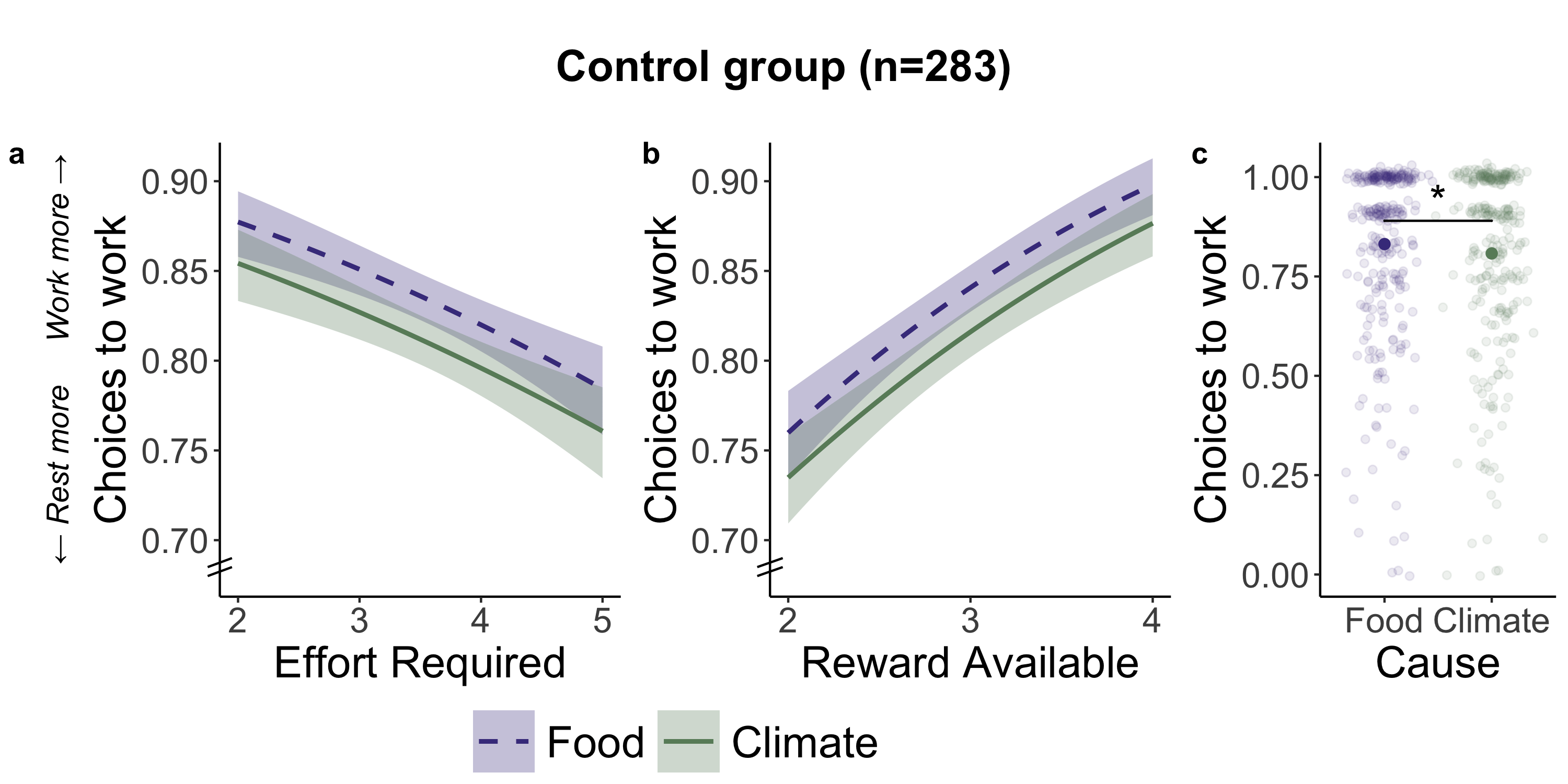 Fig. 3 Effort, reward, and cause determine choices to exert effort for the climate and food charities | a Participants in the control group, who did not experience a pro-environmental intervention, chose to exert physical effort for rewards more when the level of effort required was lower. b Choices to work were also higher when the reward available was larger. c Control participants were more willing to choose work to help the food charity compared to the climate charity.