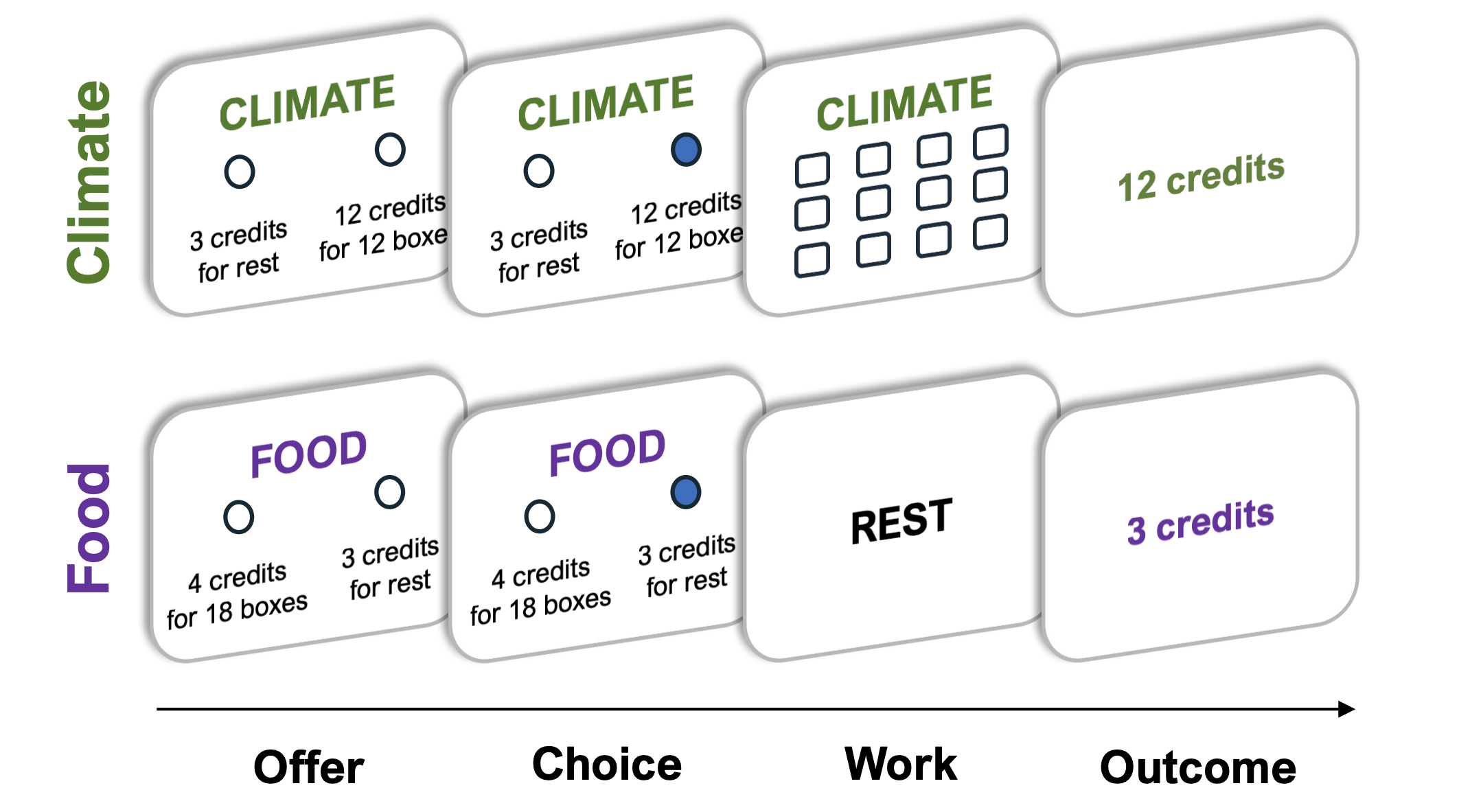 To overcome these and other issues, we designed the Pro-Environmental Effort Task (PEET). On each of 24 rounds of the task, participants can choose to ‘rest’ – not exert any effort – and obtain 3 credits, or ‘work’ – exert effort by clicking lots of boxes – to obtain a higher number of credits (4, 12 or 20). On half of the trials, credits were translated into donations to a charity that “prevents climate change by reducing carbon emissions”. On the other half, donations were for a control charity that “prevents starvation by providing food”. Importantly, if participants choose to work, they must immediately exert the effort. The level of effort required varied on different rounds and the number of boxes participants have to click is tailored to their maximum ability.
