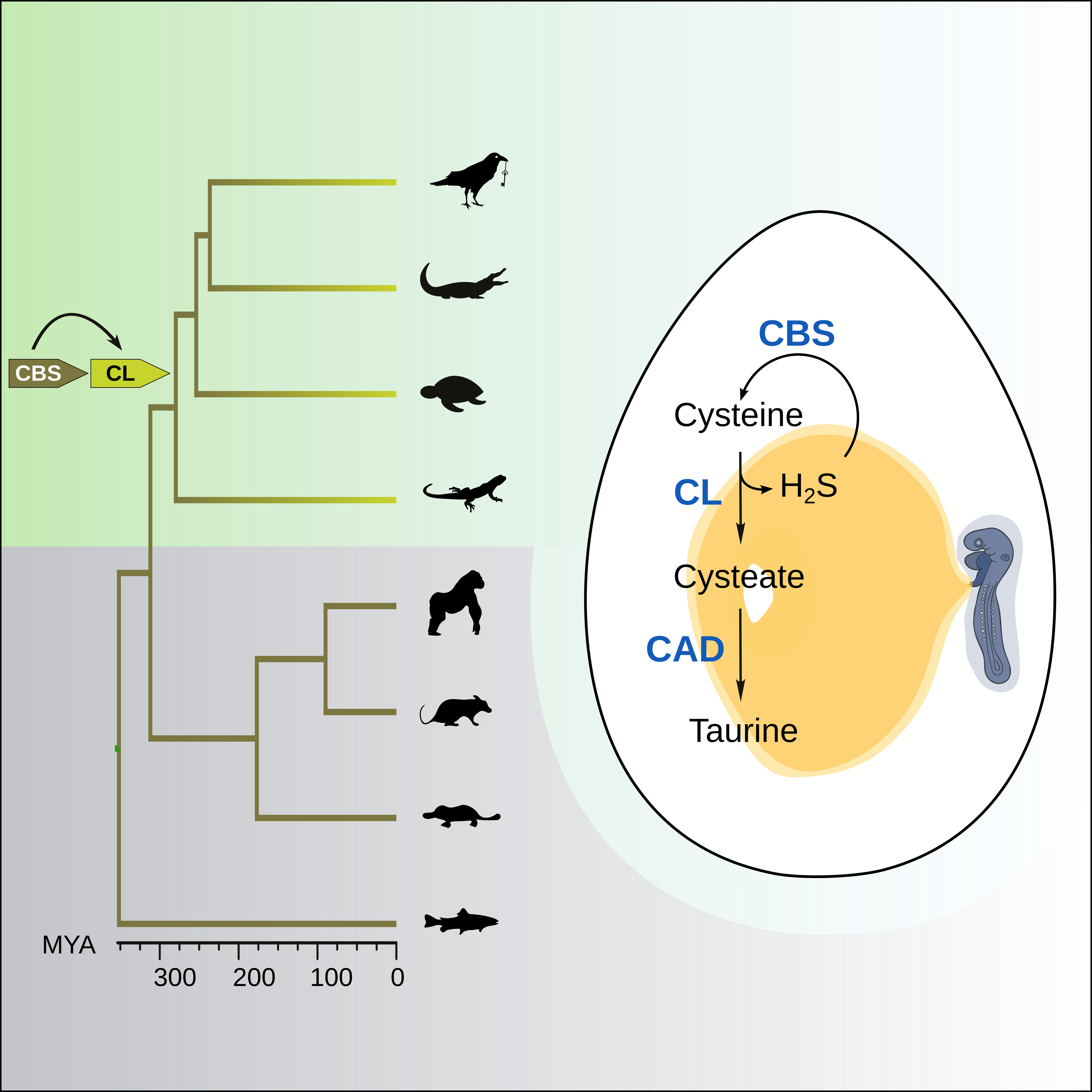 Thanks to this neofunctionalization, sauropsids are able to recycle the reduced sulfur of cysteine without oxidizing it to form taurine, an aminosulfonate required for embryonic development inside the egg. Thanks to CL reaction, the taurine sulfonic group is inserted through replacement of a thiol group by sulfite with release of foul-smelling hydrogen sulfide. This new catalytic function promoted the adaptation of CSAD, another enzyme of taurine biosynthesis, generating a rare case of alternative metabolic pathway between sauropsids and mammals.