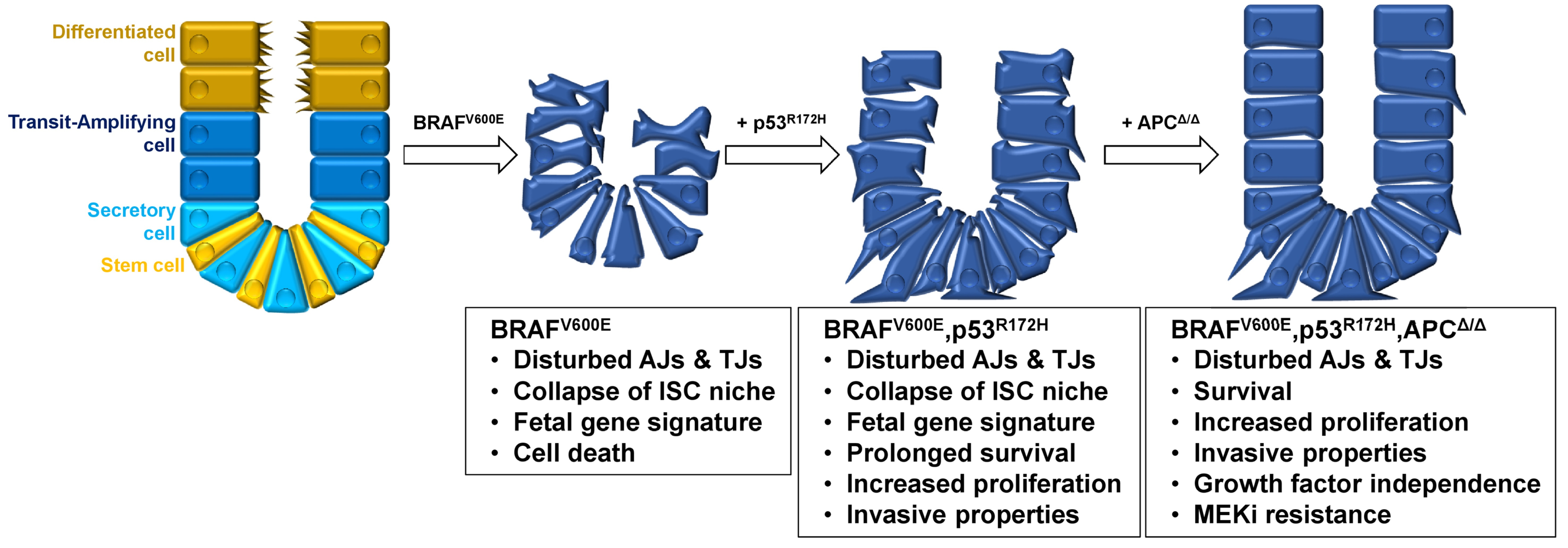 Interestingly, co-expression of p53R172H induced invasive properties in the BRAFV600E-mutant and APC-deficient organoids and, importantly, conferred resistance against the clinically relevant MEK inhibitor trametinib.
