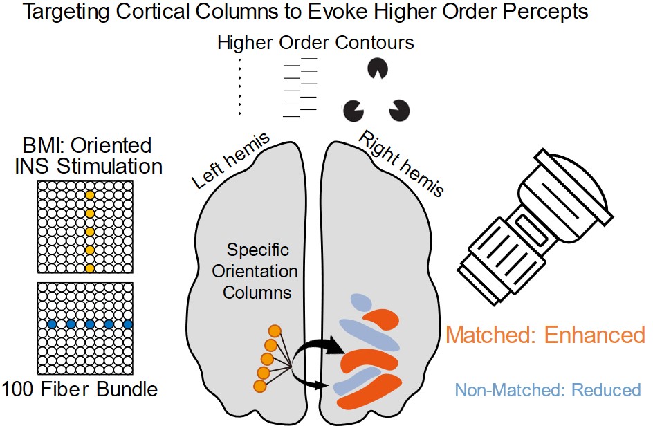 These results show that it is possible to mimic activation of circuits underlying higher-order contour perception via externally applied column-based stimulation. The critical novelty of this BMI approach is that columnar maps of known feature parameters guided the planning of stimulation sites and sequences to obtain activation of desired visual circuits. The extension of this approach to interface with shape, color, motion, and depth perception circuits offers hope for a BMI that can access the full richness of our featureful visual world.