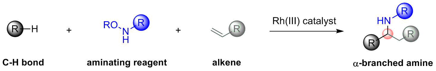 In carrying out the current work we had two primary goals. First, we sought to use alkenes as one of the coupling partners due to the very large number and variety of alkenes that are commercially available. However, we recognized that alkenes were likely to be challenging partners because they would generate unstabilized alkyl organometallic intermediates. Second, because amines are incorporated into a majority of drug structures, we were also very interested in preparing amine products by employing aminating agents as a second coupling partner (Chem. Rev. 2017, 117, 9247–9301). As we began to investigate sequential C–H bond additions to alkenes and aminating agents, we encountered two unexpected findings. We were surprised that Cp*Rh(III) catalysts were much more effective than Cp*Co(III) catalysts because Cp*Co(III) catalysts had always worked best for our previously reported three-component C–H bond additions. The reaction also proceeded by an unexpected 1,1-addition to the alkene rather than much more common 1,2-addition. This reaction outcome can be understood based upon the mechanistic studies described in our article and as supported by a rigorous study on rhodacycle equilibration reported by Bill Jones and his coworkers (Organometallics 2010, 29, 4593–4605). We look forward to further developing this three-component approach for the rapid synthesis of amines from readily available inputs. We are also exploring many other types of three-component coupling reactions that might also proceed by 1,1-alkene addition to provide access to different types of reaction products.