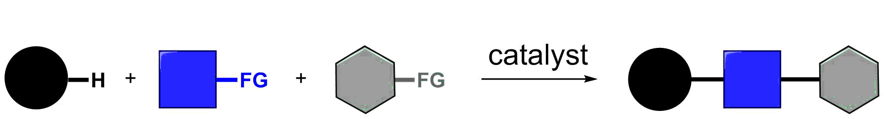 Multi-component reactions, which combine three or more coupling partners, are powerful transformations in organic synthesis because they enable the rapid generation of complex structures from simple precursors. We have recently begun to explore a new three-component coupling approach for the synthesis of organic compounds by C–H bond activation and sequential addition across two different coupling partners. We have previously reported sequential C–H bond additions to enones and aldehydes (Angew. Chem. Int. Ed. 2016, 55, 12650-12654), alkynes and halogenating agents (Angew. Chem. Int. Ed. 2017, 56, 9976–9980), and more recently to dienes and aldehydes (Nat. Catal. 2018, 1, 673–679).