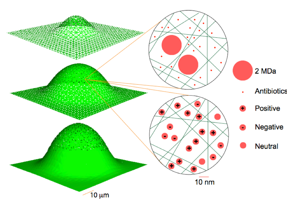 Biofilms are communities of bacteria, fungi, protozoa or algae that adhere to each other or surfaces. While biofilms involved in waste water treatment and bioremediation are beneficial, many others involved in corrosion and infections are harmful. One of the main issues of biofilms relevant in the context of human health is their increased tolerance to disinfectants and antibiotics. As a result, biofilms on medical implants are difficult to eradicate leading to recalcitrant infections. It is believed that the tolerance is due to the fact that biofilms act as diffusion barriers for antibiotics.
