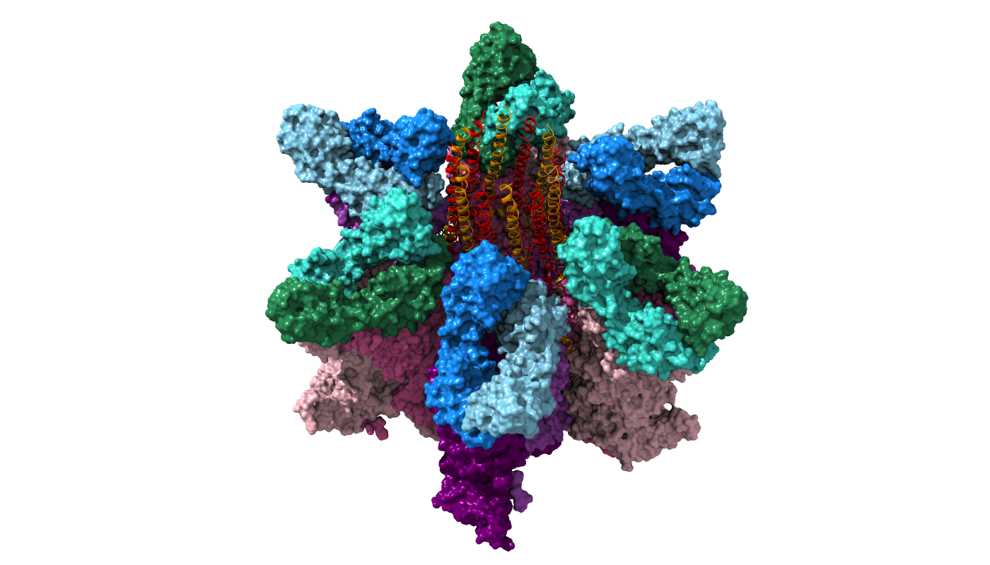 Asymmetric reconstruction of feline calicivirus bound to the receptor feline junctional adhesion molecule A revealed the presence of a portal-like structure at a unique three-fold symmetry axis. The VP2 assembly is shown (orange and red) in the centre of the surrounding VP1 (pink and purple) and fJAM-A (green and blue) proteins.
