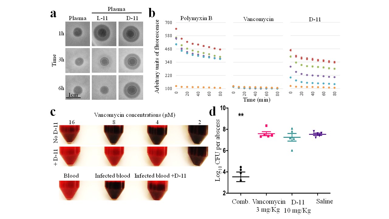 a, plasma stability analysis for L and D-11 peptides.b, outer-membrane disruption activity for several doses of D-11 compared to the same doses of polymyxin B (positive control) and vancomycin (negative control). c, combined effect of D-11 and vancomycin in blood. Dack colour indicates bacterial grow. d, activity for the combination (comb.) of D-11 and vancomycin in mice.