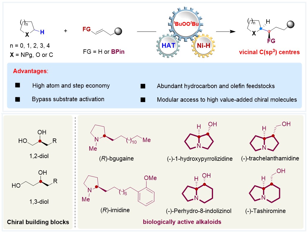 Our research team has been dedicated to achieving C(sp³)–H functionalization of various saturated oxygen heterocycles. In 2023, we successfully realized enantioselective C(sp³)–H arylation and alkenylation of oxacycles via a photoinduced HAT/nickel dual catalysis strategy (J. Am. Chem. Soc. 2023, 145, 5231–5241). In this work, C(sp³)–H bonds on oxygen heterocycles with multiple stereocenters were efficiently transformed into stereoselective C(sp³)–C(sp²) bonds. Building on this foundation, we further activated the C(sp³)–H bonds of 1-deoxyglycosides using a photoinduced HAT strategy, achieving regioselective and stereoselective functionalization under the control of a nickel catalyst and chiral ligands (Nat. Chem. 2024, 16, 2054–2065). After accomplishing stereoselective functionalization of various saturated oxygen heterocycles, we tackled the more challenging enantioselective C(sp³)–H alkylation of undirected saturated nitrogen/oxygen heterocycles—a reaction previously unreported. By Inspiring on nickel-catalysed peroxide-mediated C(sp3)–H functionalization and NiH-catalysed olefin hydroalkylation systems, we developed a stereoselective C(sp³)–H alkylation of saturated nitrogen/oxygen heterocycles using olefins.