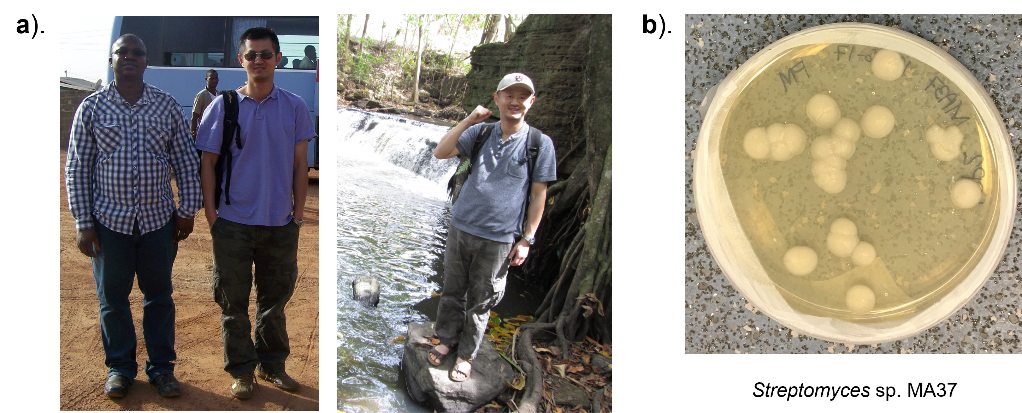 Fig. 1: a). Deng and Kwaku in Ghana (2011). b). Isolated Streptomyces sp. MA37.