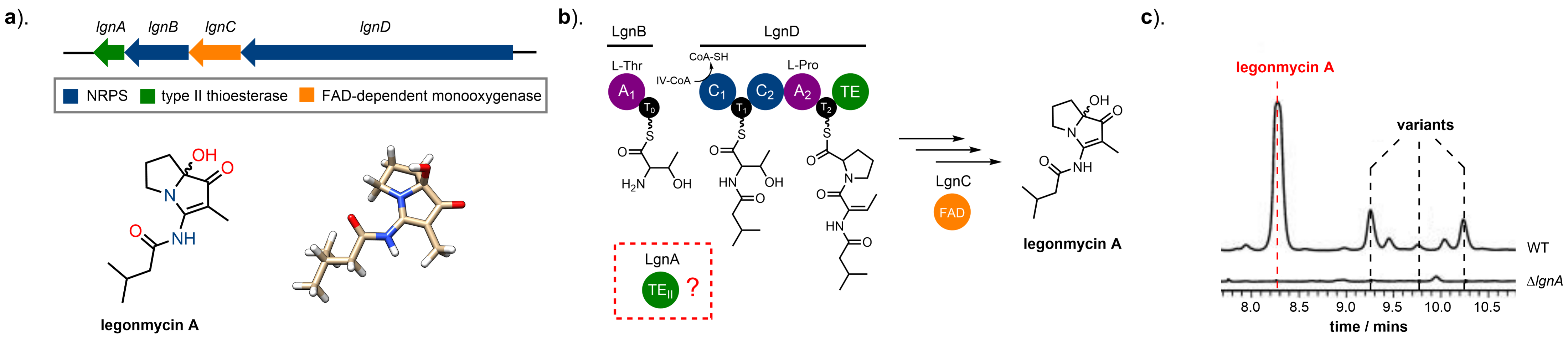 Fig. 2: a). Structure of legonmycin A and organisation of the biosynthetic gene cluster b). Proposed biosynthesis of legonmycin A by the minimal cassette, LgnA – LgnD. The role of the LgnA TEII domain remained unclear. c). Comparison of metabolite production from WT and ΔlgnA strains, showing abolishment of legonmycin production in the ΔlgnA strain.