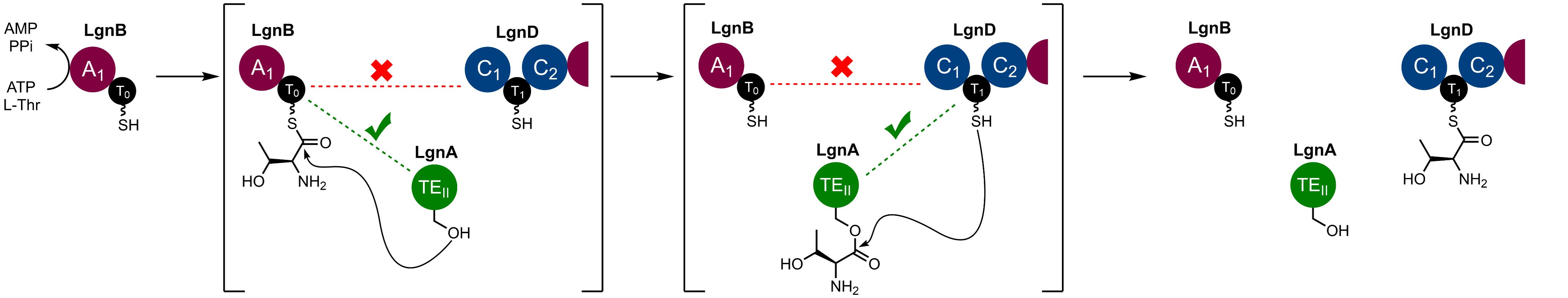 Fig. 3: Schematic representation of how LgnA-TEII facilitates communications between the NRPS subunits LgnB and LgnD.