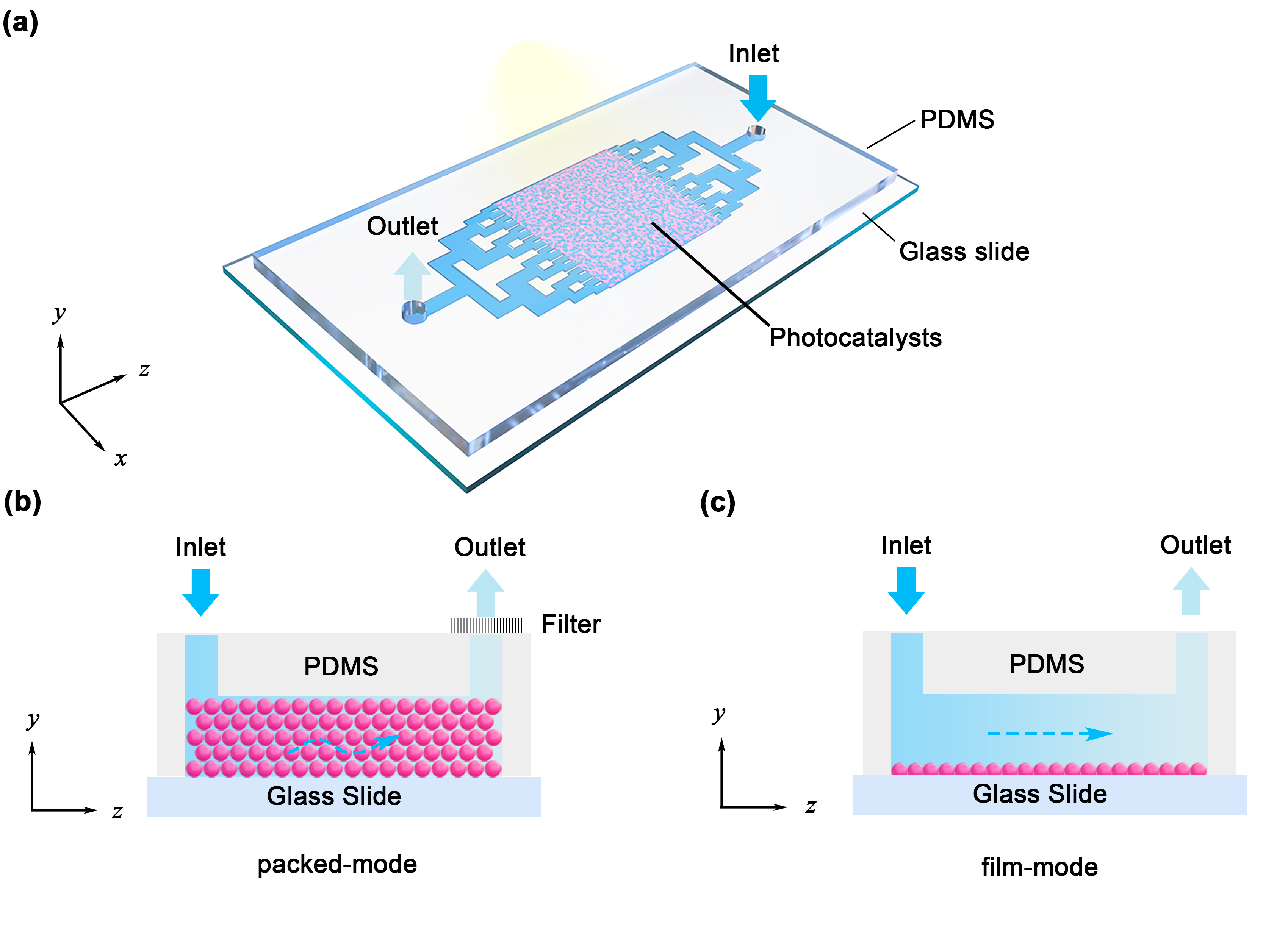 Figure 1. Schematics of optofluidic microreactors for visible light-driven water purification. (a) Three-dimensional (3D) diagram of the optofluidic microreactor loaded with photocatalysts for water purification under visible light. Cross- sectional views of (b) the planar packed-bed optofluidic microreactor (PPOM) and (c) the planar film-mode optofluidic microreactor (PFOM).