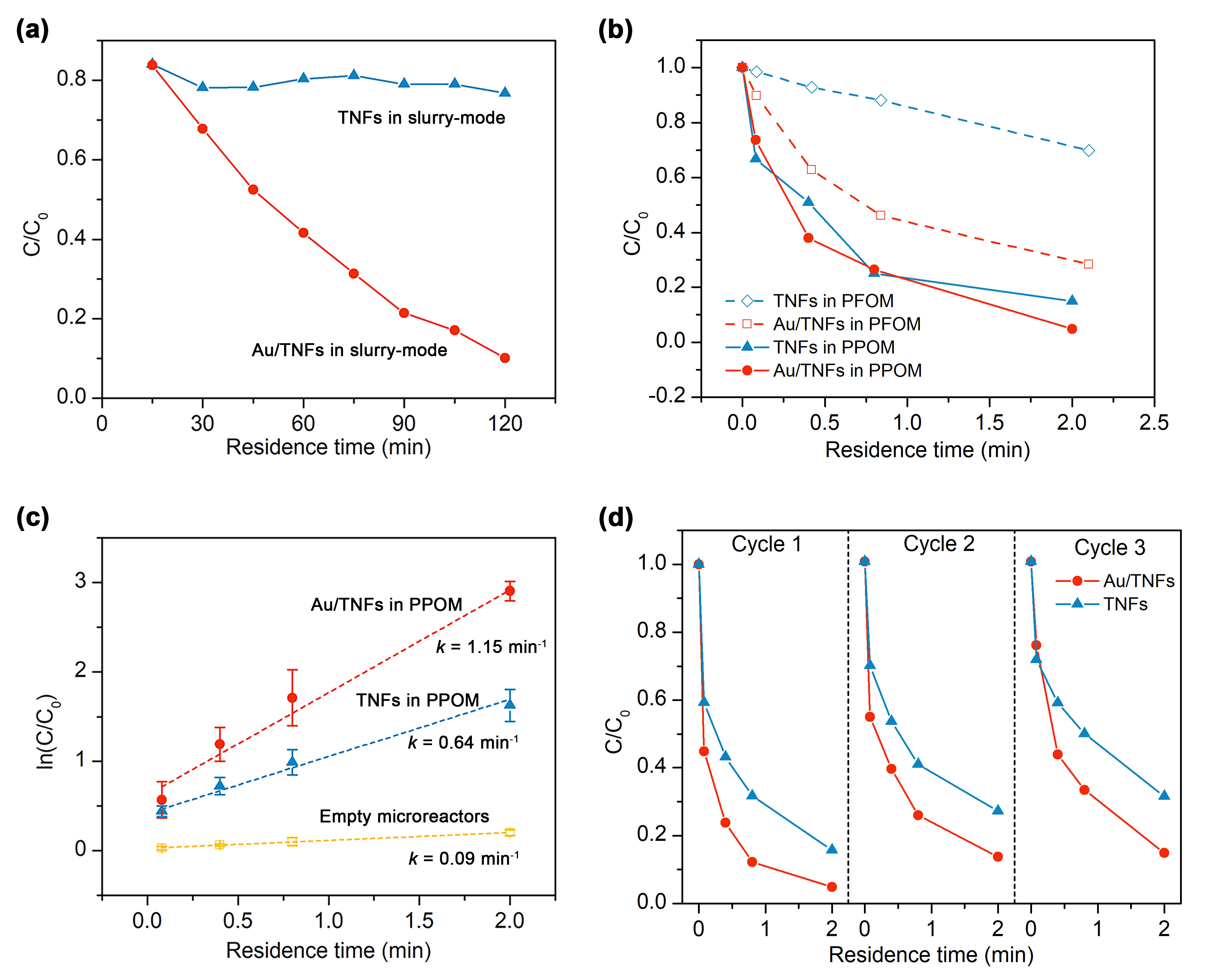 Notably, the PPOM with Au/TNFs achieved more than double the photodegradation efficiency of the PFOM. This underscores the importance of optimizing surface-area-to-volume ratios (SA:V) and optical paths in microreactors. The Au/TNFs-PPOM platform also demonstrated excellent stability and reusability (Figure 2(d)), making it a promising candidate for continuous water purification in industrial settings.