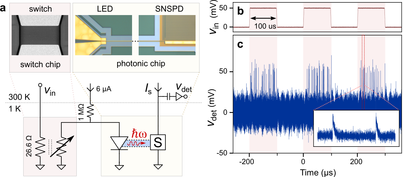Fig. 2. Using the switch to drive a photonic integrated circuit at 1K: powering a cryogenic LED with the switch and reading out the generated light using a waveguide-coupled single-photon detector. (a) Schematic and circuit setup of the experiment (b,c) Switch input and detector output versus time. When v_in is high, photons generated by the LED are transmitted via waveguide to a superconducting nanowire single-photon detector, producing detection pulses. (inset) Zoom-in of the detector output pulses.