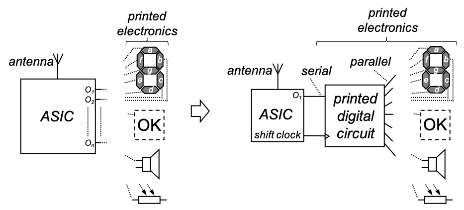 Fig. 1 Concept of hybrid electronics systems combining printed electronics and Si chips. Application-specific integrated circuits (ASIC) require a large number of pads to implement multiple functionalities. Printed digital circuits can significantly reduce the number of pads. The combination of printed electronics and Si-based electronics into hybrid electronics systems enable ultra-low-cost applications.