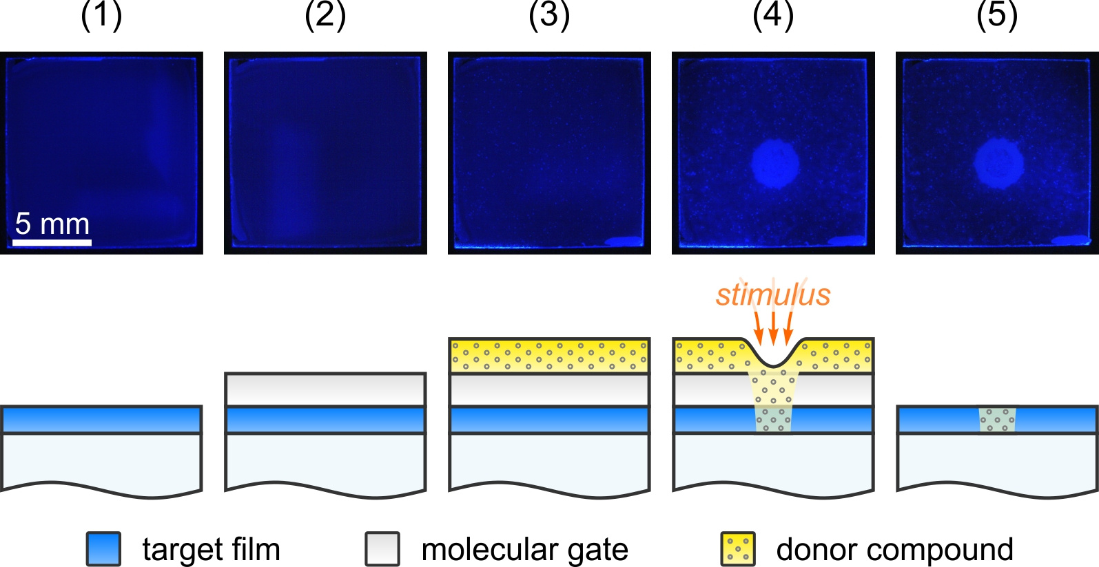 Fig. 2 Sequential processing steps of molecular-gate-based patterning and exemplary fluorescence images for a light-emitting polymer film.