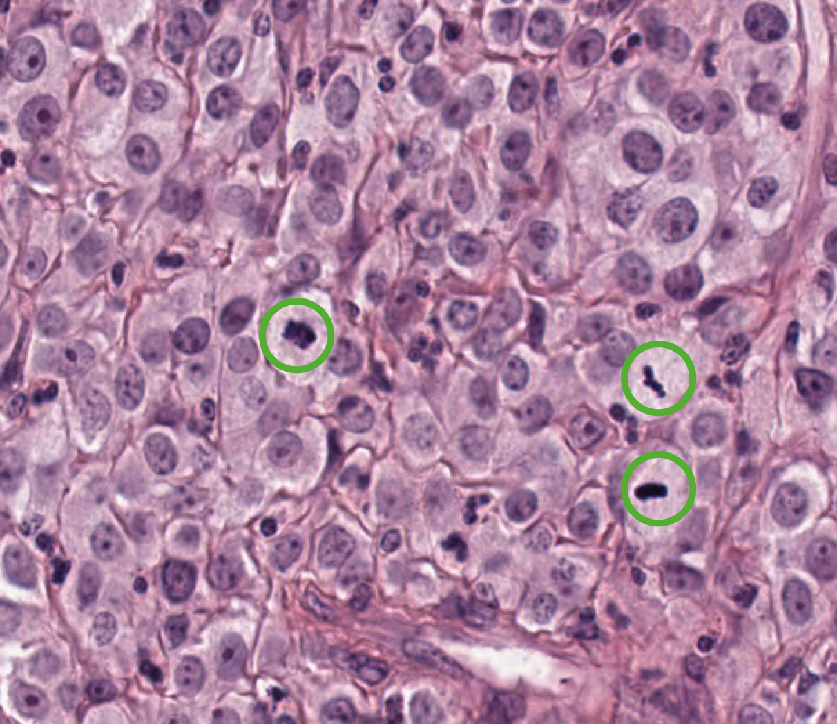 One of the things the pathologist will investigate, typically at high (400X) magnification, is the number of mitotic figures (i.e., cells undergoing division). This is how mitotic figures look like (green circles):