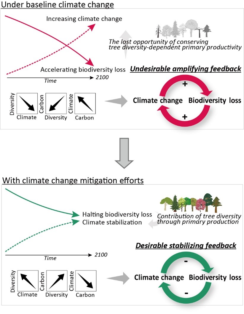 Interdependence between climate change and biodiversity. There is much emphasis on the undesirable feedbacks where climate change drives biodiversity loss (magenta arrows feedback). Here, we highlight the contribution of underutilized positive feedback in which biodiversity-dependent productivity could contribute to climate change mitigation (green arrows feedback). The conservation and restoration of tree diversity could enhance this feedback and promote the desirable pathway whereby forest biodiversity contributes to climate stabilization.