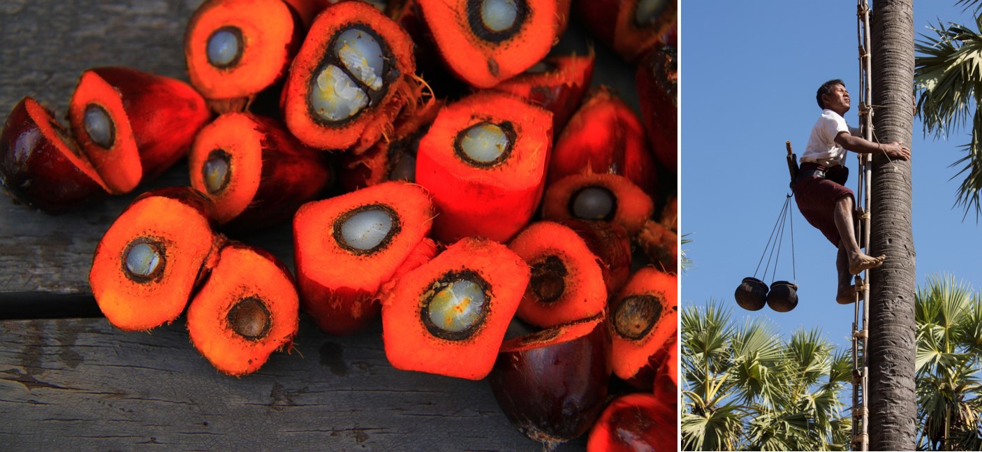 Using synthetic biology to produce plant compounds for Western industries is a growing trend which could affect the livelihoods of small farmers and alter the future of agriculture in developing countries. Left: Palm oil kernels. Right: A Burmese farmer collecting palm oil fruits (Bagan, Myanmar).