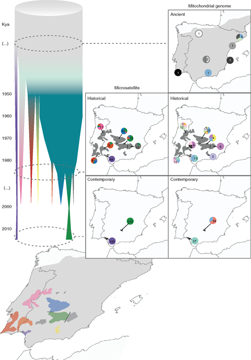 Figure 4 from Casas-Marce et al 2016 shows the dynamics of population isolation and contraction, and genetic variation from ancient to contemporary times. The Iberian lynx population is represented by a cylinder projected on the distribution map, that becomes progressively fragmented into subpopulations which contract, become genetically differentiated and eventually go extinct. Maps represent the distribution of microsatellite (left) and mitogenomic variation (right) among ancient (top), historical (middle), and contemporary populations (bottom).