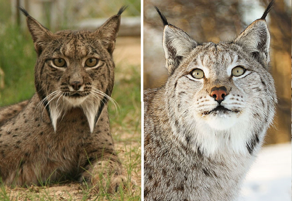 On the left, the Iberian lynx (Lynx pardinus), CC BY 2.5 Programa de Conservación Ex-situ del Lince Ibérico www.lynxexsitu.es. On the right, the Eurasian Lynx (Lynx lynx), CC BY-SA 2.0, photo by Erik F. Brandsborg