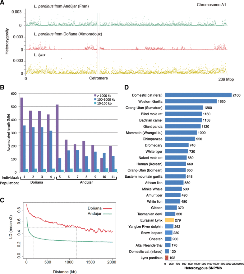 Patterns of genomic variation in 11 Iberian and 1 Eurasian lynx. D shows heterozygous SNP rates in genome-sequenced mammals. The Iberian lynx genome, and species-wide SNP rate and heterozygosity are the lowest reported to date. Taken from figure 4, Abascal et al 2016.