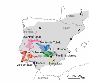 Distribution of ancient (light grey), historic (coloured) and contemporary Iberian lynx populations (marked in black) - the only extant populations are at Doñana and Sierra Morena/Andújar. Taken from Figure 1, Casas-Marce et al 2017.