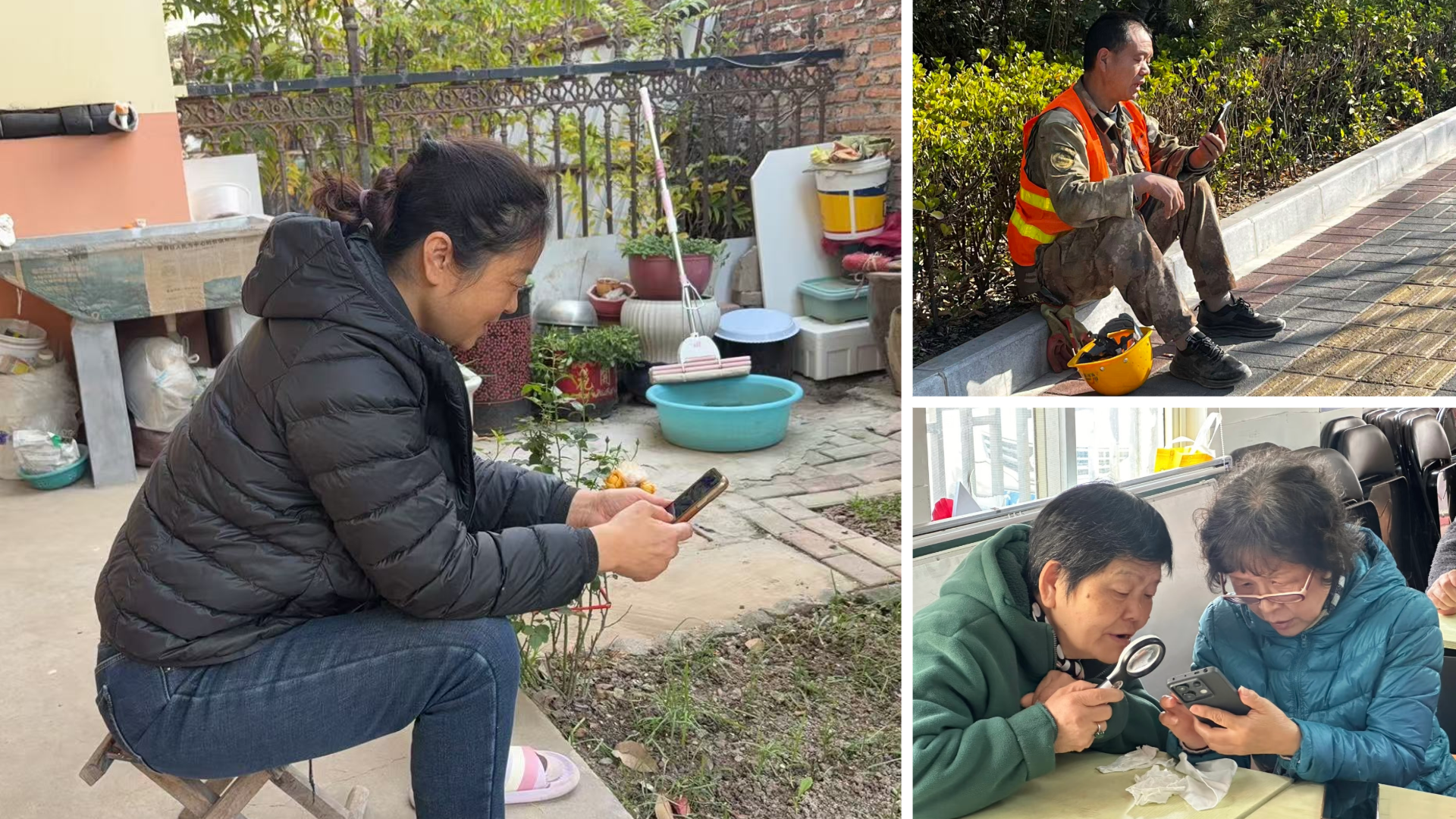 (Image: Photos from rural pilot sites, showing community residents using their smartphones to interact with the chatbot .)