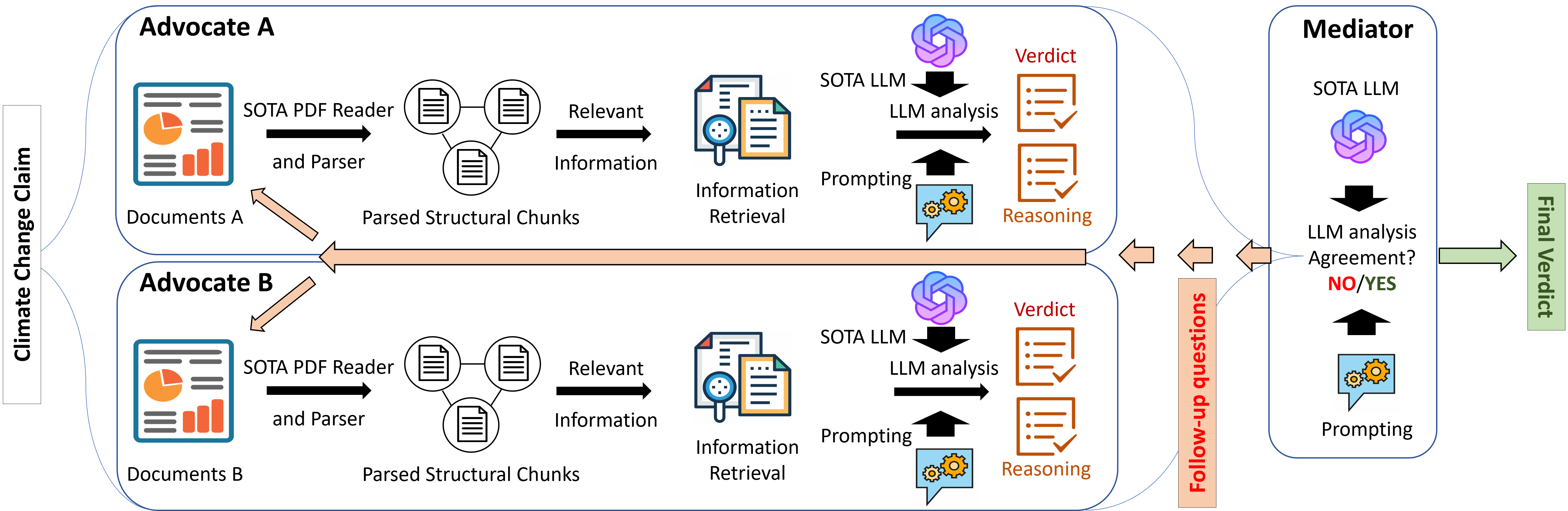 • Multiple “Advocate” models analyze a specific climate-related claim.