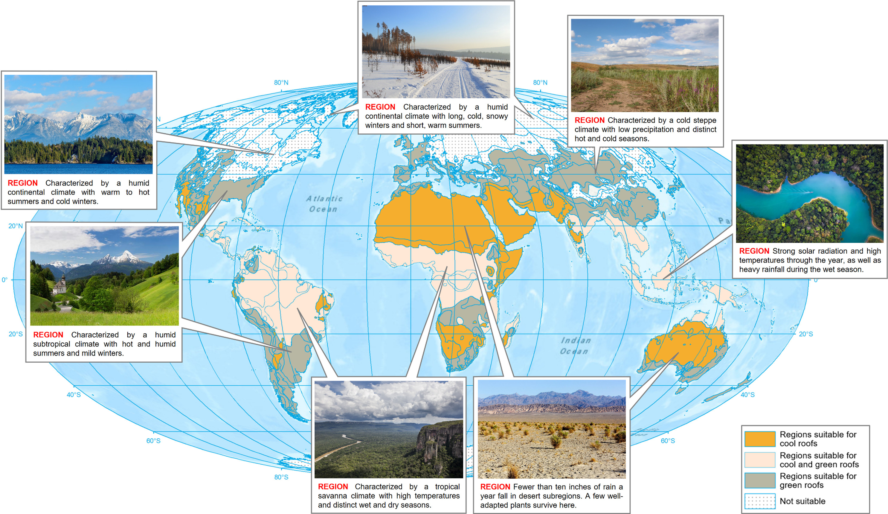 The energy-saving effects of cool roofs and green roofs largely depend on the climate zones in which they are implemented. Both roof systems demonstrate significant potential in reducing cooling energy demand across various climates, while the increase in heating energy demand associated with cool roofs should be considered in cities with colder climates.