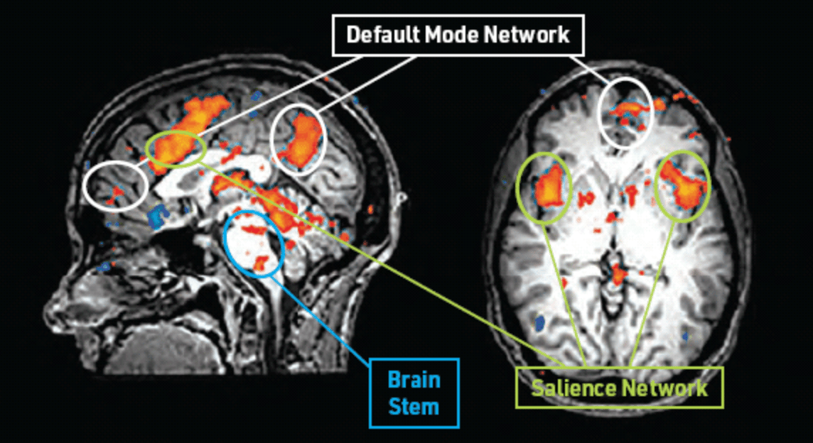 In research conducted by Mary Helen Immordino-Yang, individuals watched videos depicting true stories while undergoing fMRI scanning. When participants reported finding the story emotionally meaningful and personally relevant, the orange areas in the brain images above showed coordinated activation. These areas fall within the Default Mode Network and Salience Network, in addition to the brain stem, which is critical for consciousness, attention, and basic survival functions like breathing and heartrate. (The Executive Control Network was also involved but isn't visible in these views.)