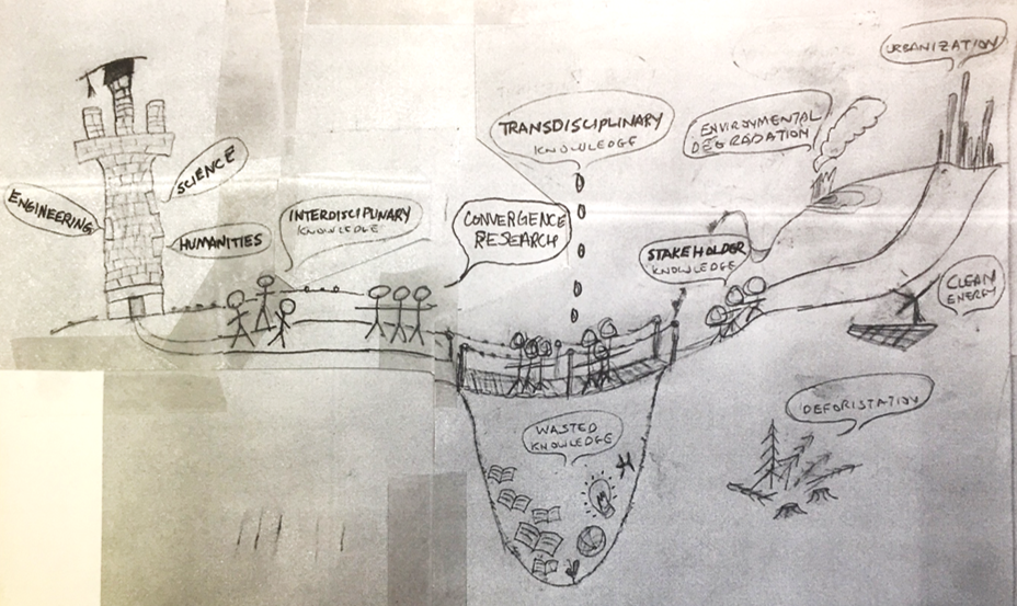 In a subsequent version of the sketch, we added an ivory tower on the academic side, which housed disparate disciplines, to emphasize the still siloed structure of most academic enterprises, and used word balloons to highlight key concepts. These concepts included the necessity for the academic enterprise, including universities, research organizations, funding agencies, professional societies and national academies, to foster and support interdisciplinary and convergence research on the academic side of the bridge, and transdisciplinary knowledge generation between academics, practitioners and other stakeholders.