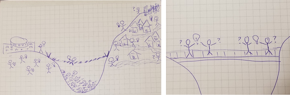 We needed an illustration of the problem, and our first sketches tried to represent the situation in panels. The initial panel had academics throwing out both ideas and publications, where they accumulate in an abyss, or valley, that divides the worlds. Crises, as well as ideas and questions, are seen growing just across the valley, which is inhabited by practitioners and society at large. There is only a rickety, unstable bridge spanning the divide. An academic trying to traverse the bridge falls through a rotten plank as they carefully shield their idea from harm by holding it aloft. At the same time community members on the other side of the valley, one with an idea and the other with a question, are walking down to approach the bridge. The next panel showed what could be -- if only we had a stable bridge that we could rely on for working together to co-create the necessary knowledge and solutions for global sustainability.