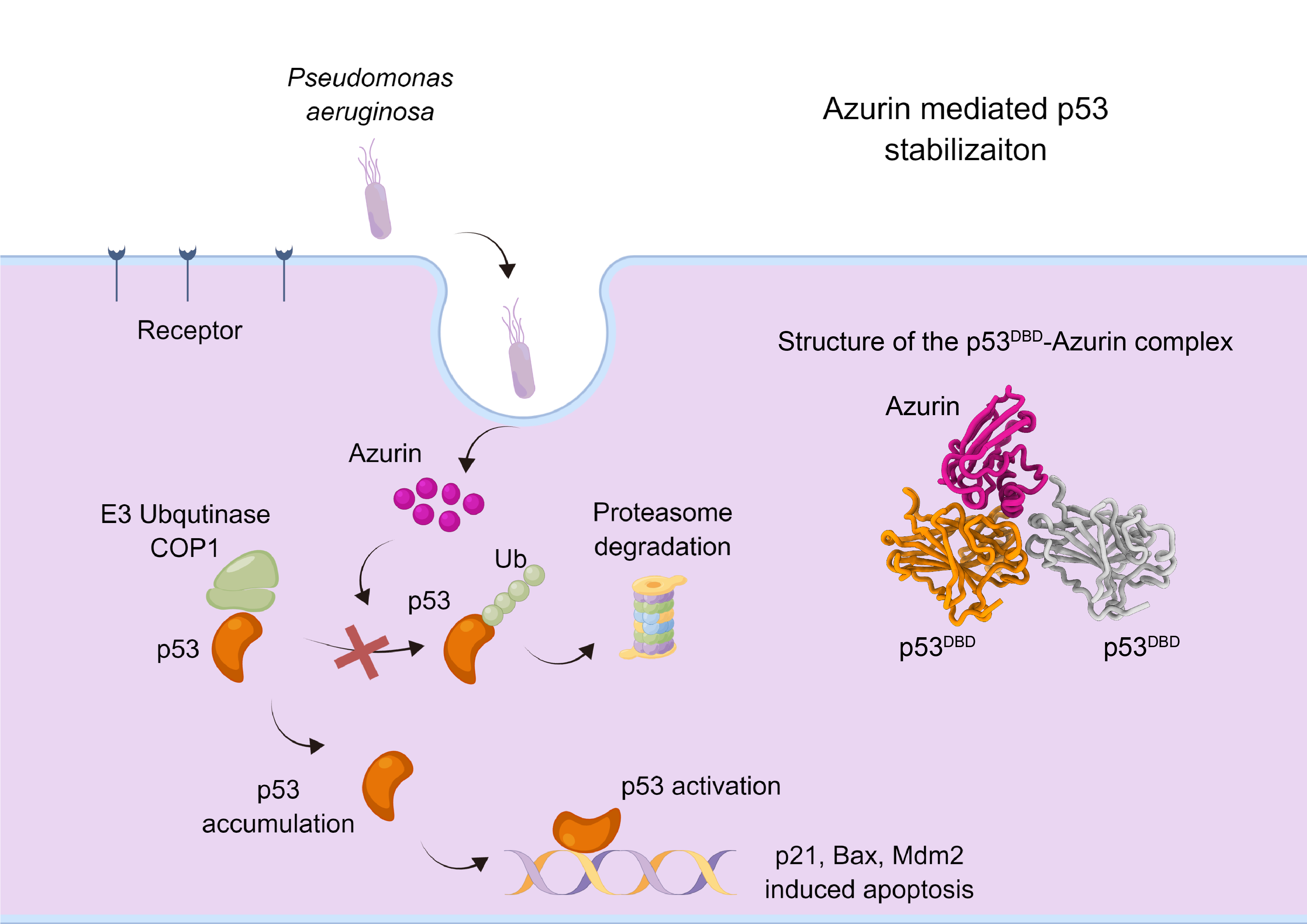 Numerous studies have shown that azurin and its derived peptides preferentially penetrate tumor cells and trigger apoptosis by stabilizing functional active p53. The lack of structural and mechanistic information on the p53-azurin complex has limited our understanding of azurin-regulated p53 stabilization and impeded the development of new anticancer azurin-derived peptides. Therefore, we set up our first goal to reveal how azurin specifically recognizes p53 and stabilizes it from degradation.