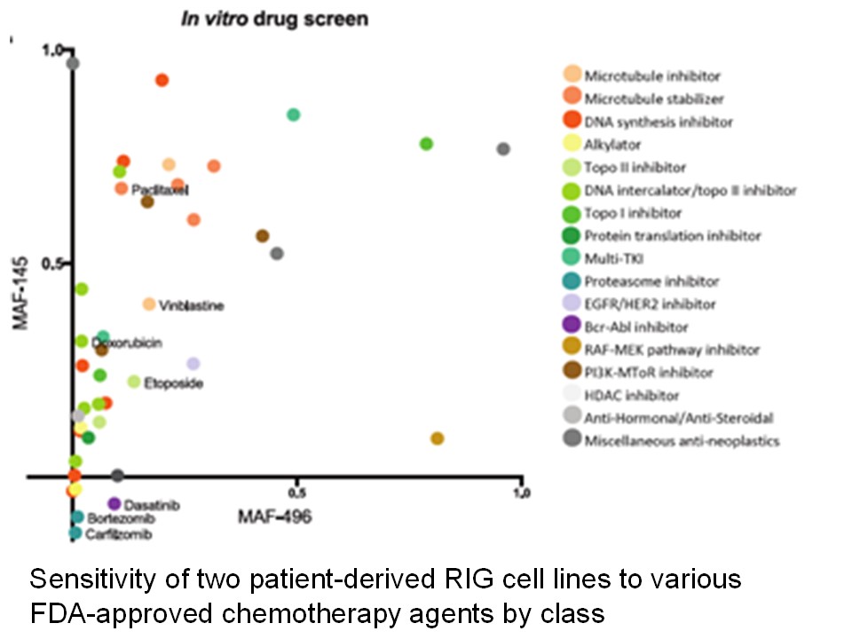 Researchers from our group at Children’s Hospital Colorado and the University of Colorado Anschutz Medical Campus previously published findings showing that gene expression of RIGs differs from that of primary pediatric high-grade gliomas (1). Through a collaboration with researchers at St. Jude Children’s Research Hospital and the Childhood Cancer Survivor Study, we recently assembled the largest group of RIG samples to date with the goal of performing comprehensive molecular profiling in order to advance our understanding of RIG tumor biology. We also performed drug screening of patient-derived RIG cell lines to determine possible treatment targets (see figure below).