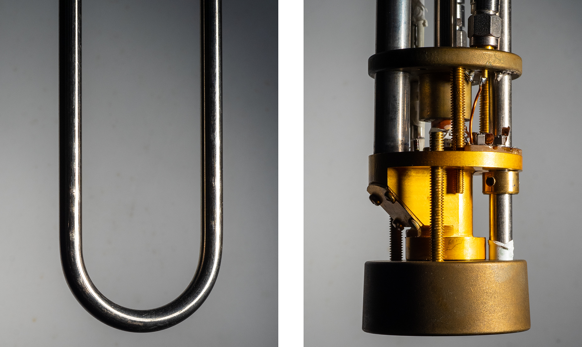 Figure 1 The original bent tube (left) and the bullet-DNP insert (right). Substantial modifications were needed to test the transfer of hyperpolarized solids.