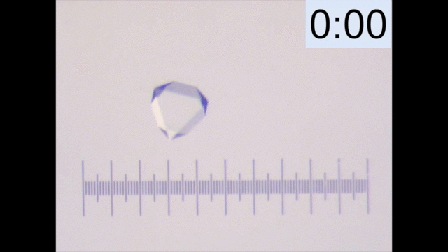 Our first test was to take a crystal-hydrogel hybrid and transfer it into deionized water. To our delight, the crystal started expanding slowly over the course of minutes! The crystal seemed to expand uniformly in all directions and contracted back to its original size after adding salt. This behavior is very similar to a polyacrylate gel. Contraction of the crystal-hydrogel hybrid occasionally lead to cracks, likely due to a temporary spatial gradient of salt throughout the lattice. Remarkably, these cracks spontaneously self-healed as the salt solution equilibrated throughout the material. This behavior is shown in this short video below: