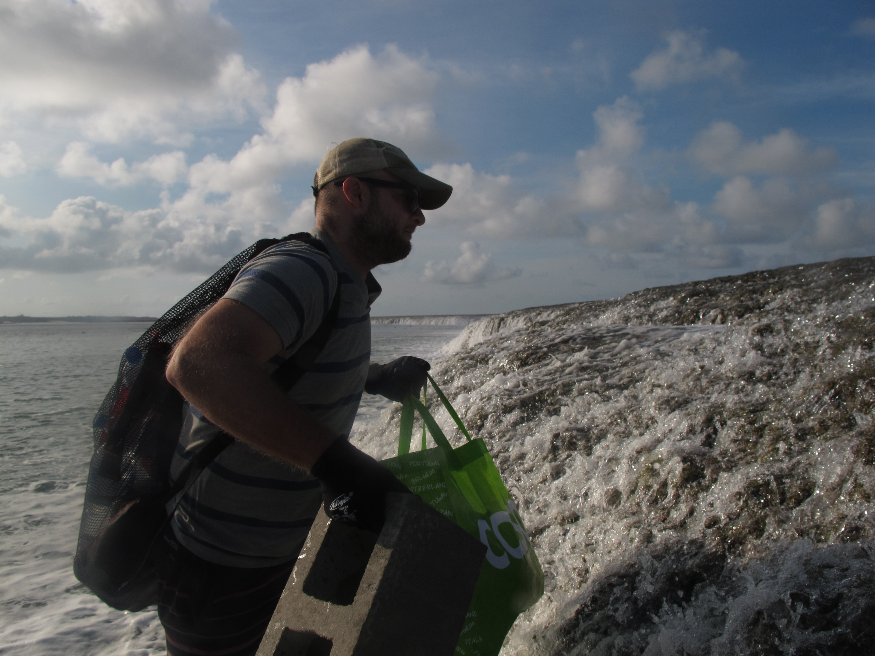 Co-first author, Dr Steeve Comeau carrying mooring blocks for sensors over Tallon Island's reef crest.