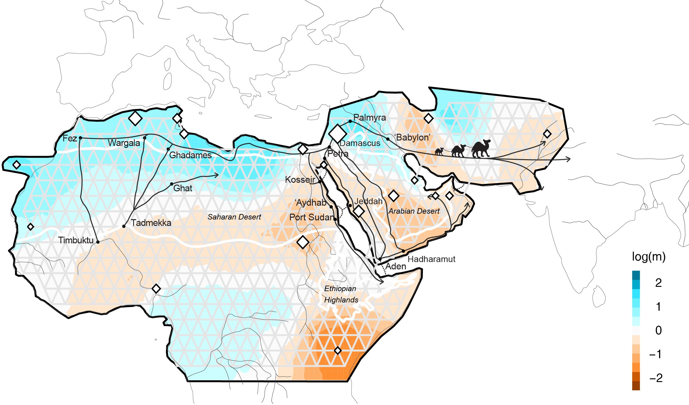 Inferring Effective migration patterns in the global population. EEMS plot representing the posterior mean of effective migration rates (m) (on a log10 scale) across space. With this normalization, significantly higher than the overall average rates are represented in blue (“corridors”) and significantly lower than the overall average rate ( “barriers”) are represented in brown. Samples are represented by diamonds and the size is proportional to the number of sampling. Ethiopian Highlands and Arabian Desert are highlighted with white lines. Black lines represent historical network of caravan routes, i.e. Incense and Silk roads and main trans-Saharan gold trade networks.